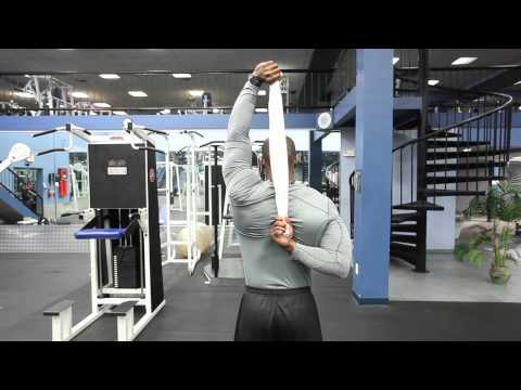 The back shoulder stretch is the basic stretching motion for the shoulder muscles. They may be performed either with a towel or rope to bridge the gap between the two hands. If the user is flexible, he may perform the stretch without a towel or rope, simply by putting his hands together and pulling. The user should be careful not to stretch too far or stretch too hard. This can do more harm than good. Stretching is important and should be incorporated in all exercise routines. Stretching can help limit injury to the ligaments and muscles. By stretching the muscle before working out, you can actually lift more weight.