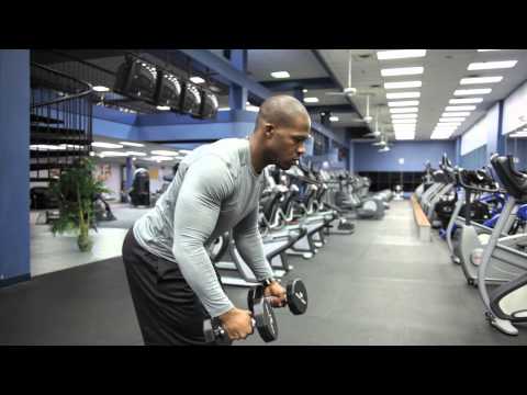 Step 1. With a dumbbell in each hand, bend over at the waist until your upper body is at a 45 degree angle. Your palms should be facing each other.