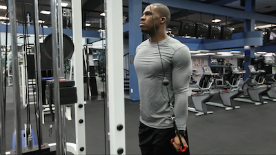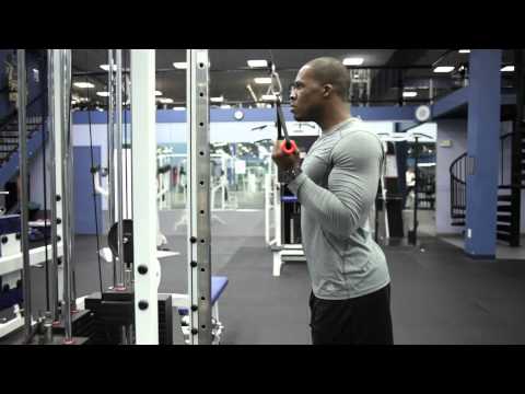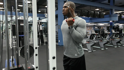Step 2. Use an underhand grip and pull the weight down until your arm is straight. Keep your elbow pressed to your side, so only your forearm is moving.