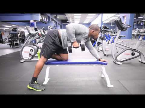 The one arm dumbbell row is a strength and size building exercise that works each side of the back independently. By performing this exercise one arm at a time, the user is able to assure that one side of the back does not develop more than the other. Because this exercise is done with higher weight than the one arm cable row, it is important to support your body to prevent injury to the low back. The off-leg should rest on a bench and the off-hand should rest there as well. Once you have found a comfortable position, do not move from it during the course of the exercise. Even though the one arm dumbbell row is a size and strength exercise, you still should not cheat by using your body to help the weight up. Instead, lower the weight all the way down and get a full stretch and then pull back up in a controlled manner for a good range of motion.