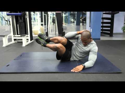 The side jackknife with both legs is a core exercise for working the obliques. The obliques are an often overlooked part of the core, but they should be trained as part of a complete core workout. This exercise is a more advanced oblique exercise. One hand goes behind the head and the elbow should touch the knee at the top of the motion. This is a good guide for how to perform the exercise properly. When first performing this exercise, the user should place the free hand on the ground for support. Once the user becomes more comfortable with this exercise, he may place the free hand behind the head and engaged the core muscles for balance. As with all jacknives, it is important to keep the core tight throughout and not relax the muscles.
